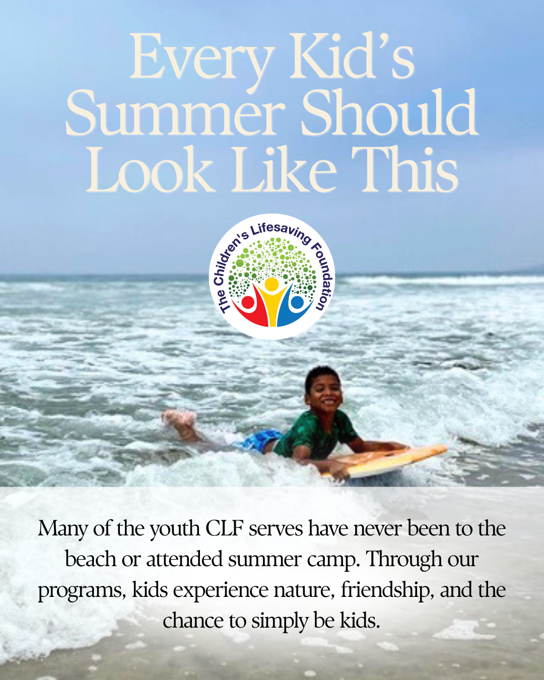 Our Mission: The Children’s Lifesaving Foundation (CLF) is a non-profit, 501(c)(3) organization, dedicated to transforming the lives of underserved, BIPOC youth and houseless families living in shelters and transitional housing in Los Angeles through a unique approach of providing outdoor education through amazing Summer and Surf Camps, inspiring Holiday Events and awesome Field Trips in and around Los Angeles, and Educational Assistance and Scholarships for youth through to college-age. We also provided crucial Emergency Funding during the COVID-19 Crisis to the families in our Vita Network.
